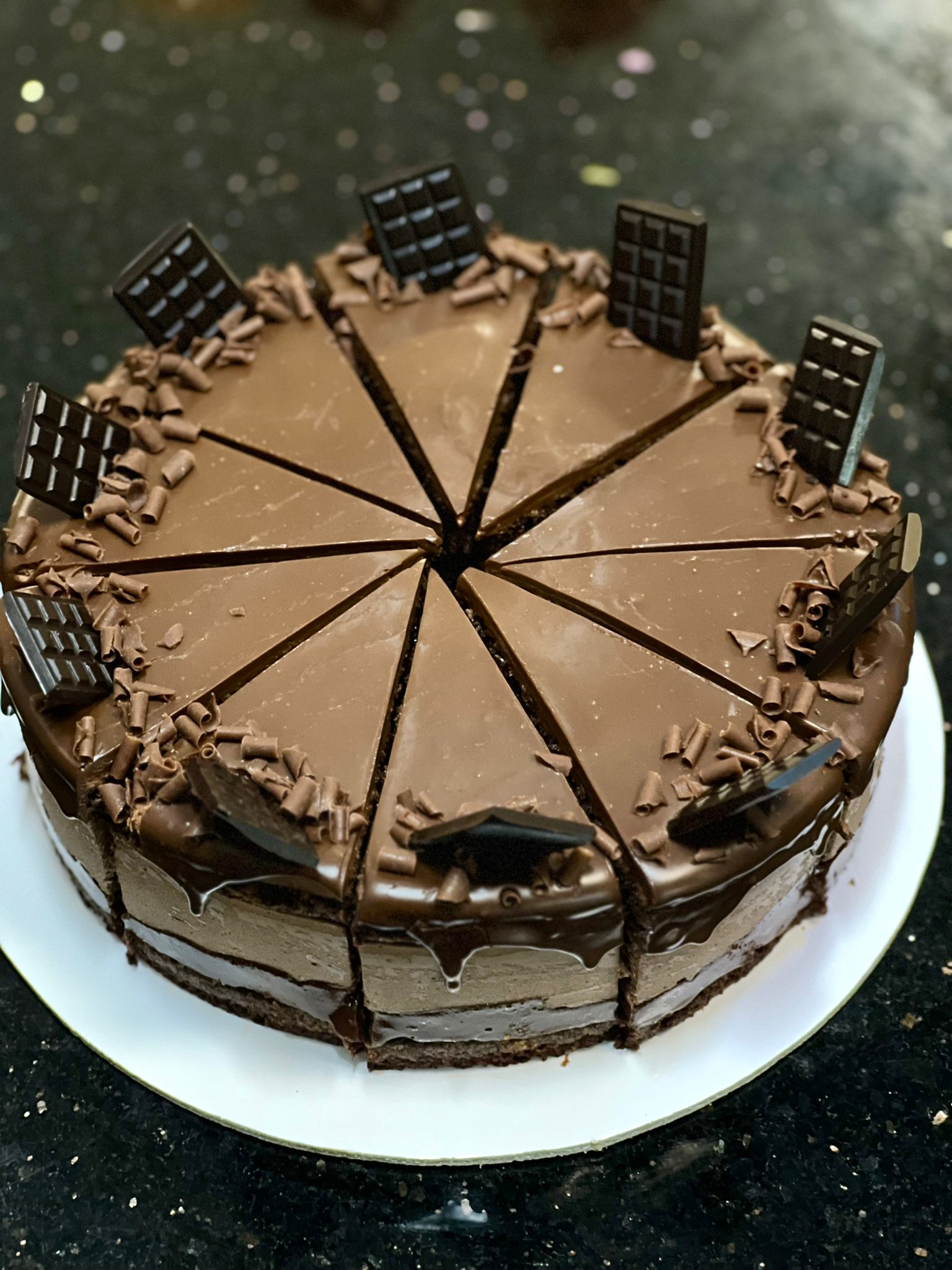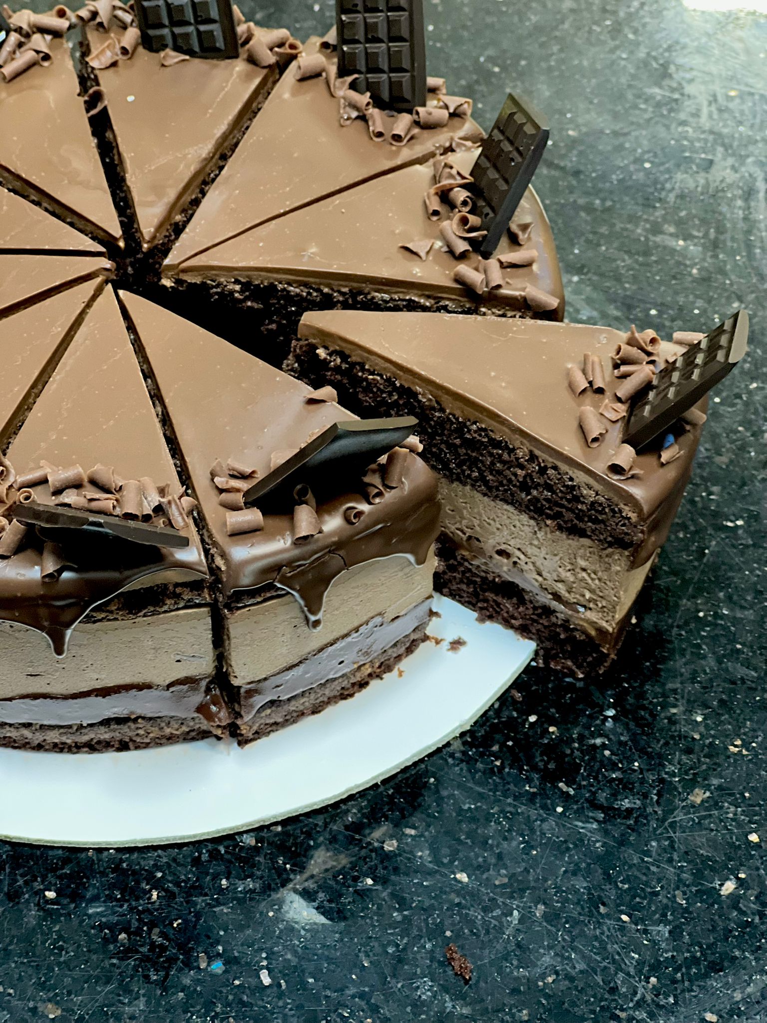 Blat de ciocolata, crocant de ciocolata si alune de padure, mousse de ciocolata